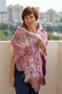 По материалам курса вы сделаете классический (мужской) шарф с кистями, шарф с волоконной бахромой, шарф на марле с декором из префельта и прорезным декором, палантин на шелке с рюшами и объемными шелковыми розами.