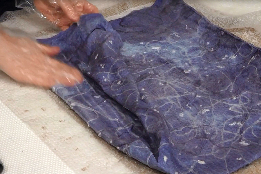 Я покажу процесс валяния шапки-чалмы до готовности. Вы узнаете, какими способами можно валять войлочное полотно, чтобы сохранить фактуры и пластичность, как сделать ровный и аккуратный край, как проконтролировать размер и симметричность усадки изделия, и когда нужно остановиться. Мы научимся определять степень готовности войлока для шапочки, валять изделие, не деформируя его.
