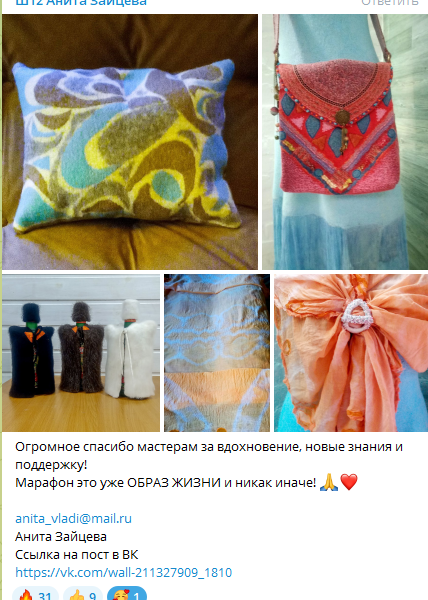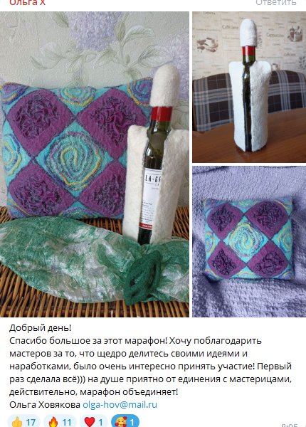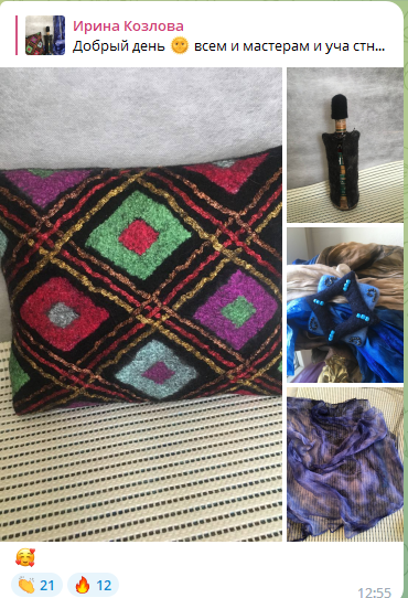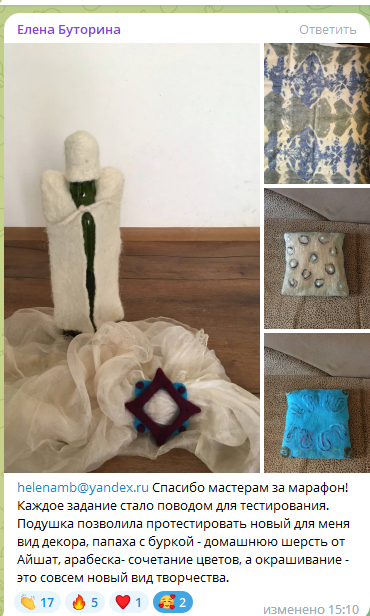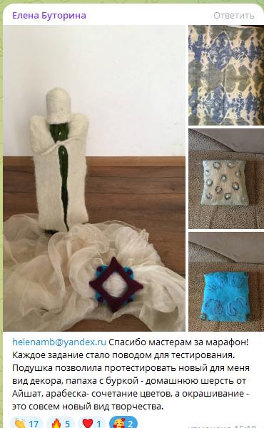 Имеет большой опыт реализации работ из войлока и работы на заказ, запуска образовательных проектов по валянию из шерсти (курсы, марафоны, обучающие программы).