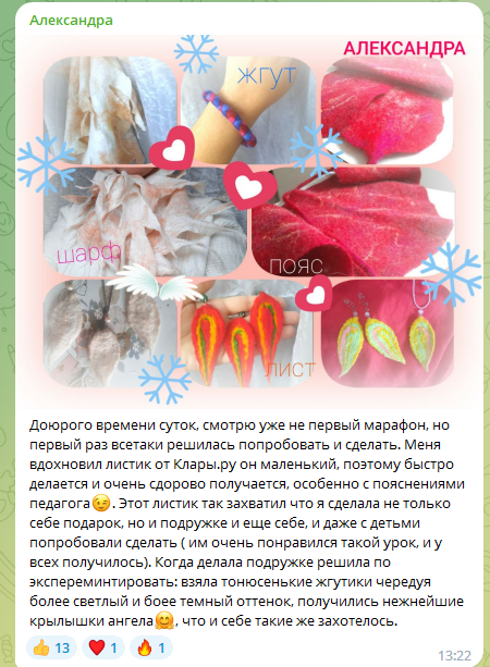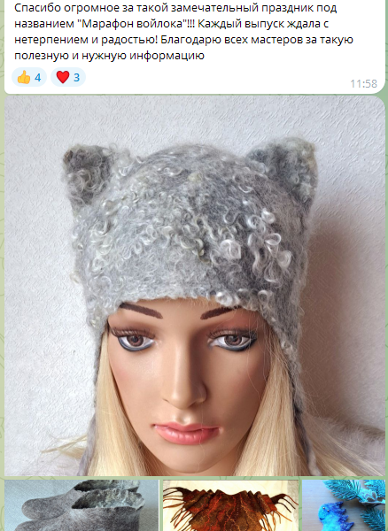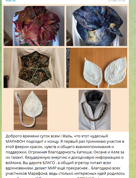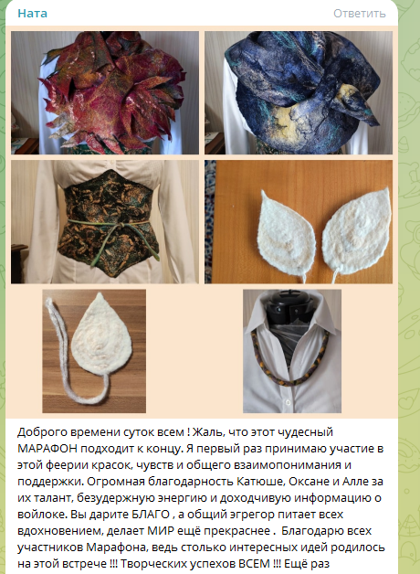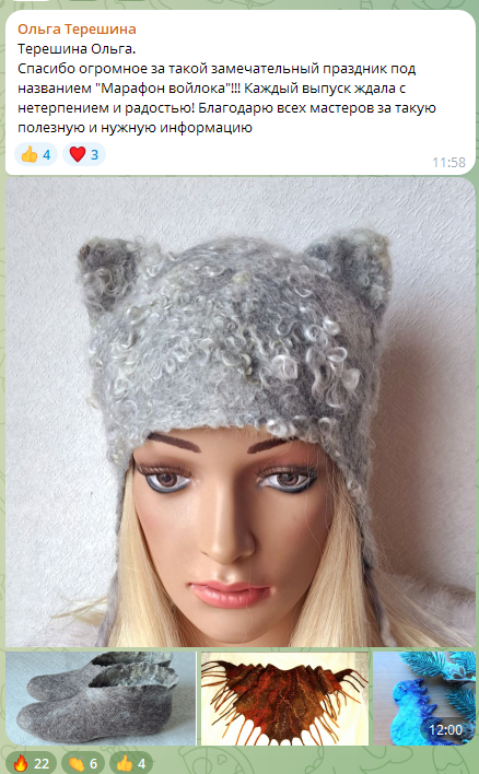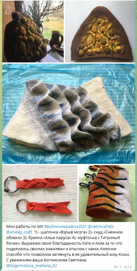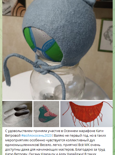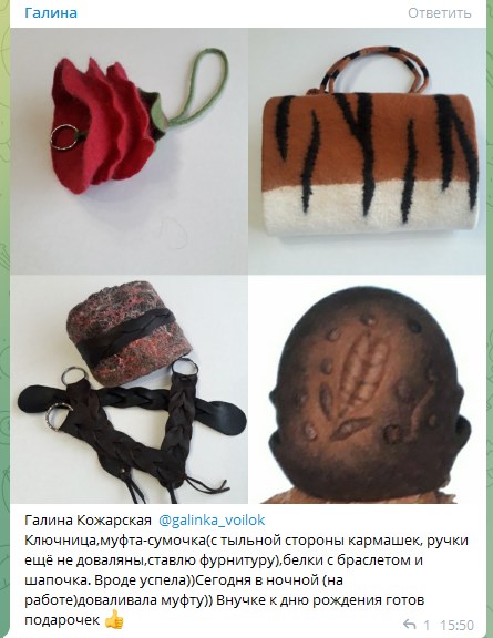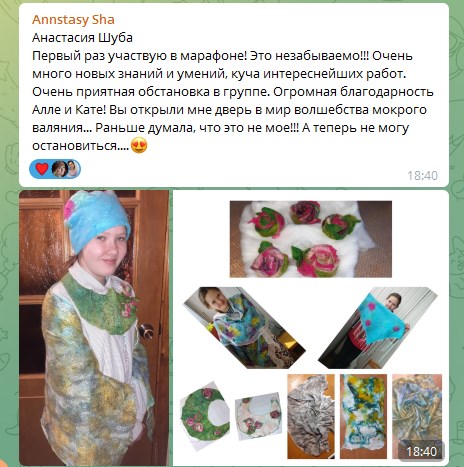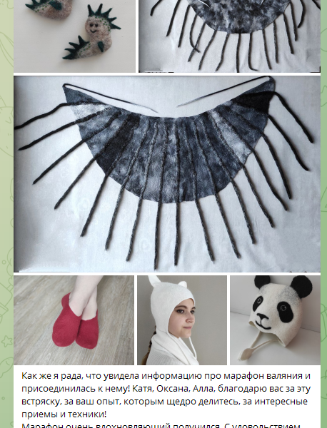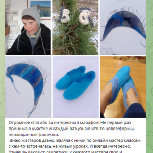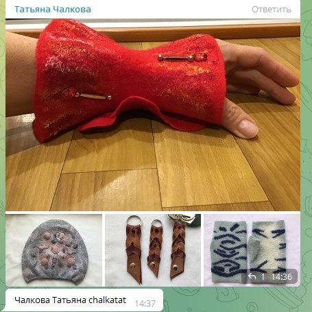 Представляла коллекцию одежды « Осенний конфитюр» на Формуле Рукоделия. Основное направление мастера — тонкий войлок. Но и тапки Татьяны известны на всю страну.