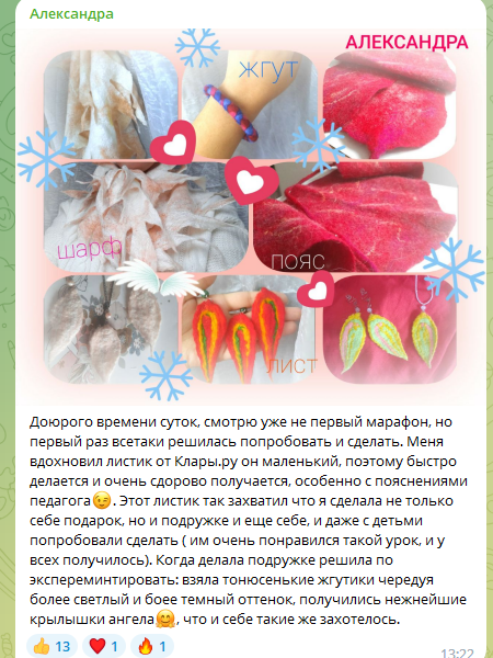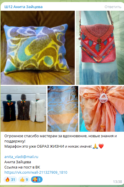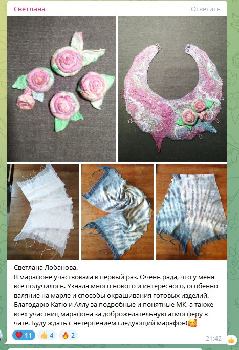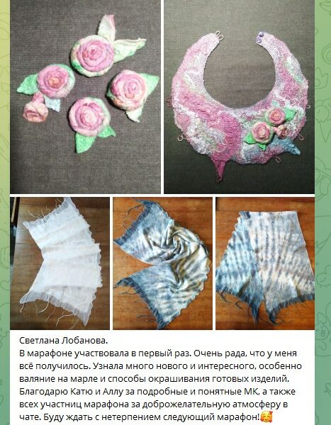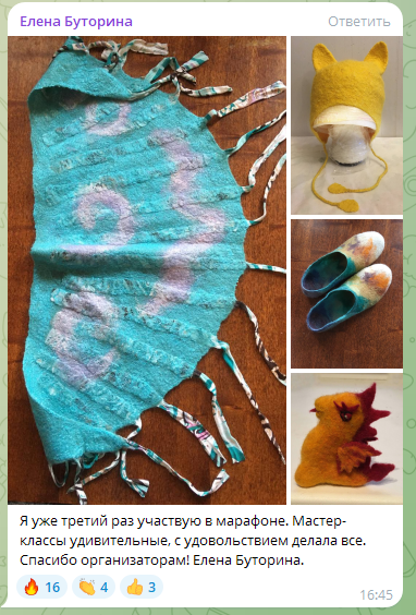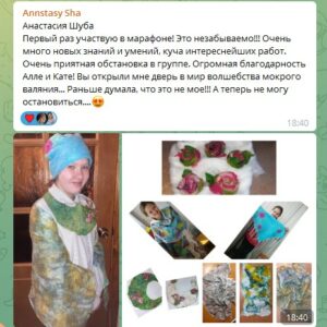 Более 7 лет проводит мастер- классы по валянию. Более 300 учениц освоили технику валяния тонких палантинов на очных мастер-классах Татьяны.